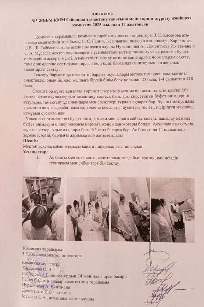 Анықтама "№3ЖОББМ" КММ бойынша тамақтану сапасына мониторинг жүргізу жөніндегі комиссия 2025 жылдың 17 желтоқсан