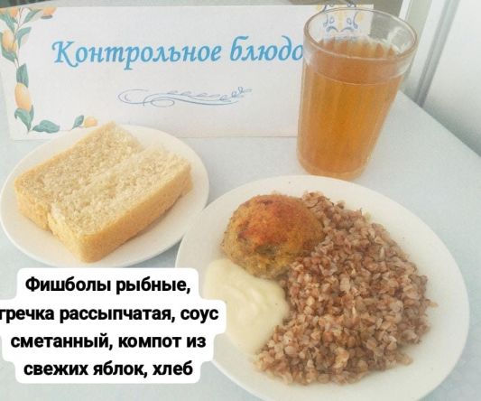 Бүгінгі мәзірі: балық шарлары, ұнтақталған қарақұмық, қаймақ соусы, жаңа алма компоты, нан.