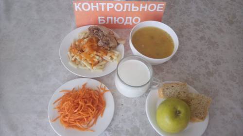 Күнделікті бақылау тағамдары шығарылады: сорпа, вермишель, тауыктын ет, сәбіз салаты, алма, шай сутпен, нан.