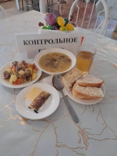 Бүгін мәзірде: сорпа кеспе, қуырылған ет, табиғи шырын, ірімшік, бал, нан.