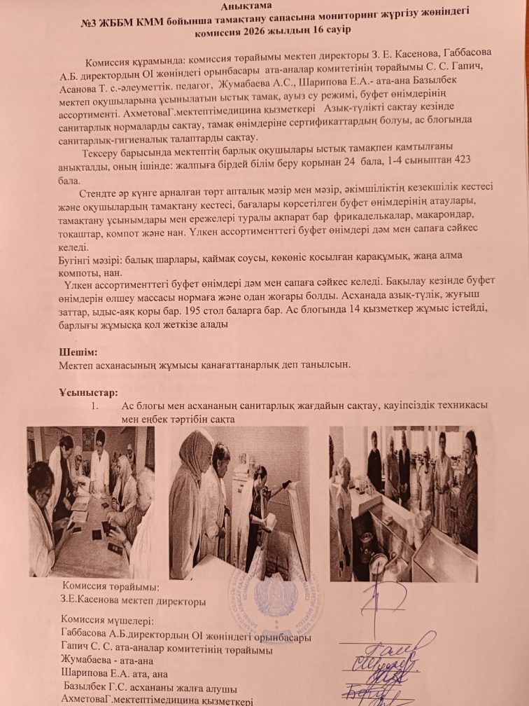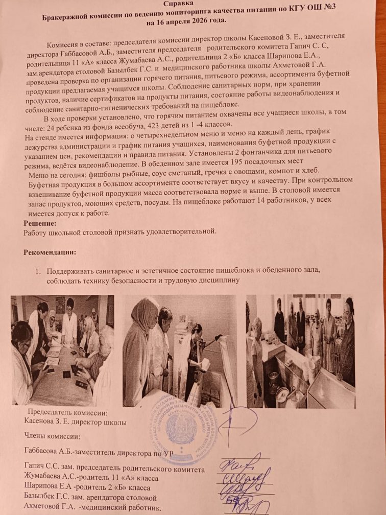 Анықтама "№3ЖОББМ" КММ бойынша тамақтану сапасына мониторинг жүргізу жөніндегі комиссия 2025 жылдың 16 сәуір