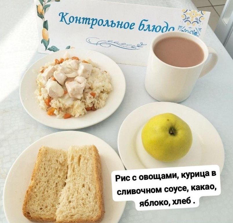 Бүгінгі мәзірі: көкөніс қосылған күріш, кілегейлі соустағы тауық еті, какао, алма, нан.