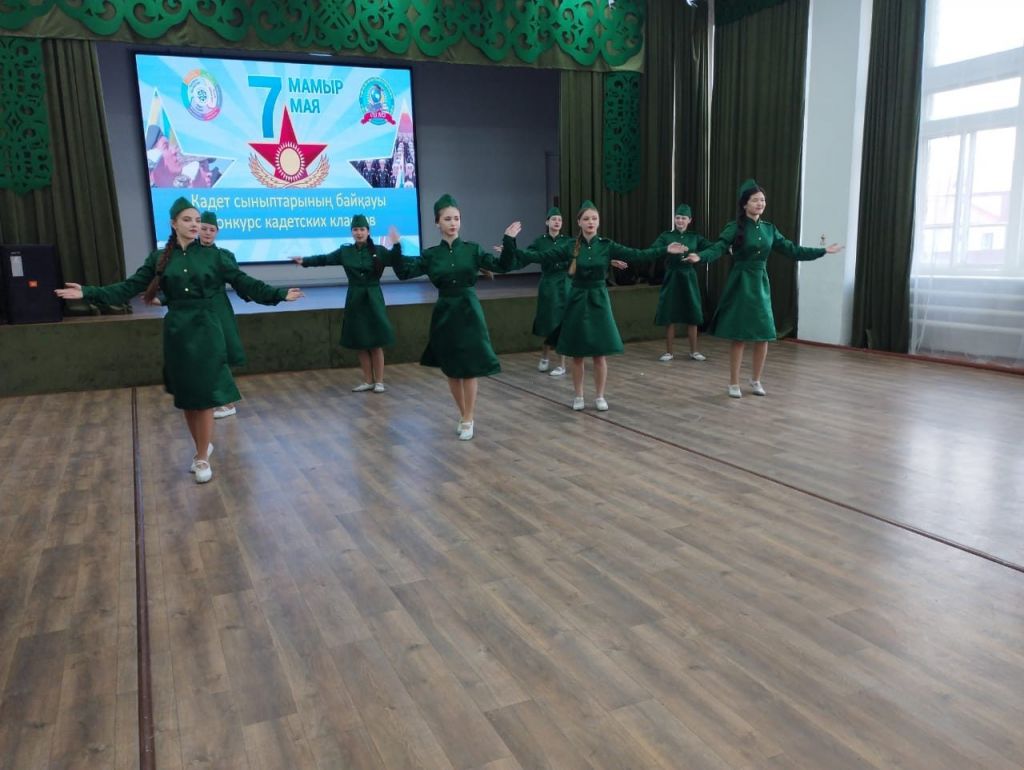 Байқау бағдарламасына саптық дайындық элементтері, көрсетілімдер және НТВП оқытушысы Бышева Н.В. жетекшілігімен шығармашылық нөмірлер енді.