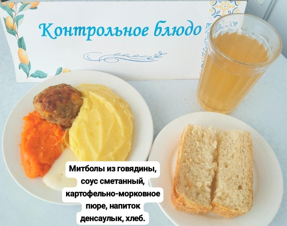 Бүгінгі мәзірі: сиыр еті, қаймақ соусы, картоп пен сәбіз пюресі, денсаулық сусыны, нан.