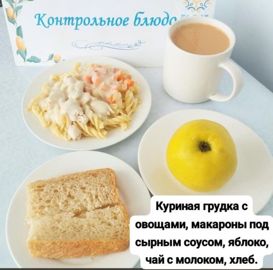 Бүгінгі мәзірі: тауықтың төс еті көкөніспен, макароннан ірімшік соусы, алма, сүт қосылған шай, нан.