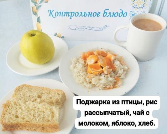 Бүгінгі мәзірі: қуырылған құс еті, ұнтақталған күріш, сүт қосылған шай, алма, нан.