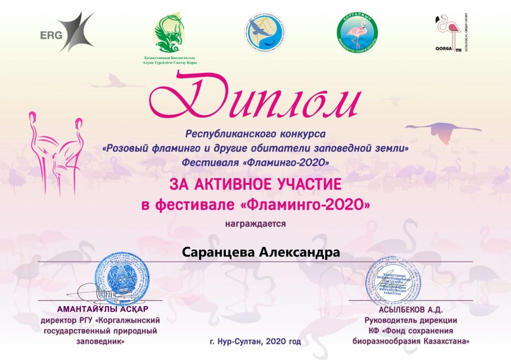 10 сынып оқушысы Саранцева Алина «Фламинго -2020» атты фестивальға белсенді қатысқаны үшін дипломмен марапатталады.
