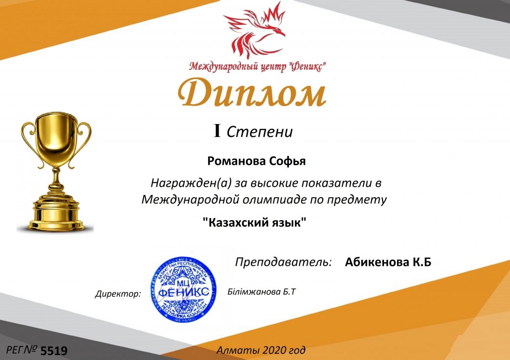 № 3 орта мектебінің 8 сынып оқушысы Романова Софья 1 дәрежелі дипломмен марапатталады