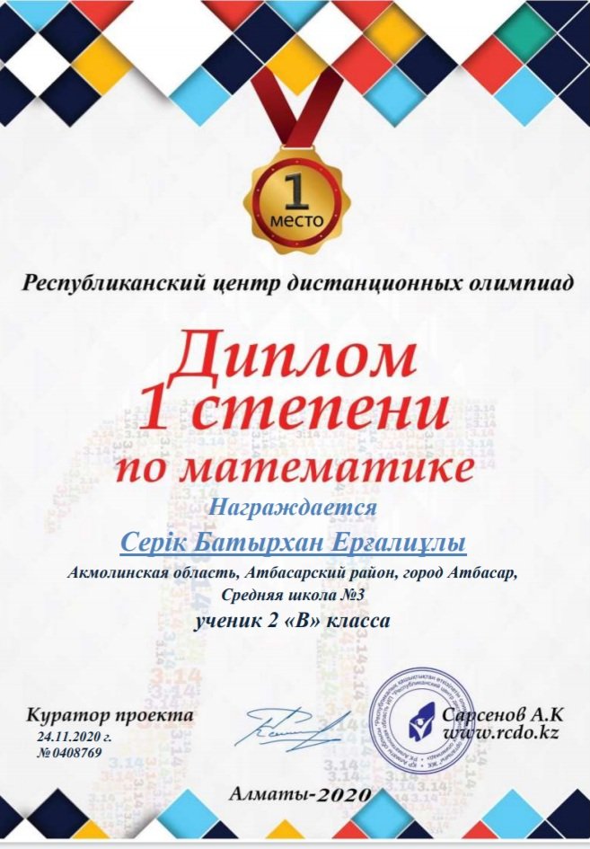 № 3 орта мектебінің 2 сынып оқушысы Серік Батырхан 1 дәрежелі дипломмен марапатталады