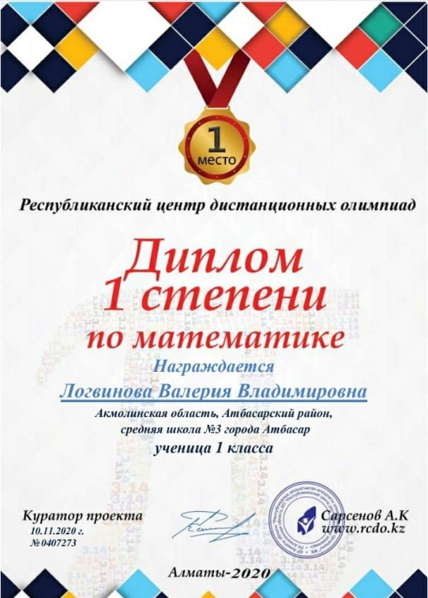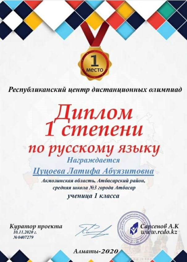 № 3 орта мектебінің 1 сынып оқушысы Цуцоева Латифа 1дәрежелі дипломмен марапатталады