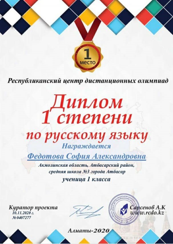 № 3 орта мектебінің 1 сынып оқушысы Федотова София 1дәрежелі дипломмен марапатталады