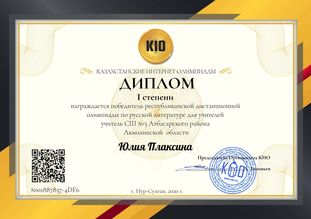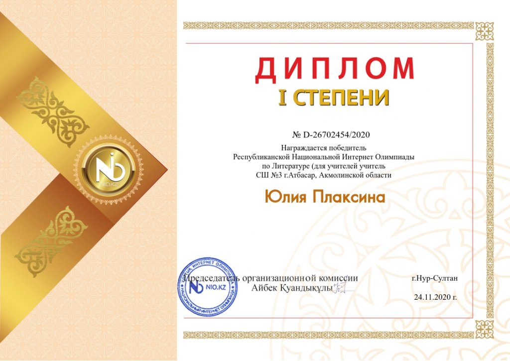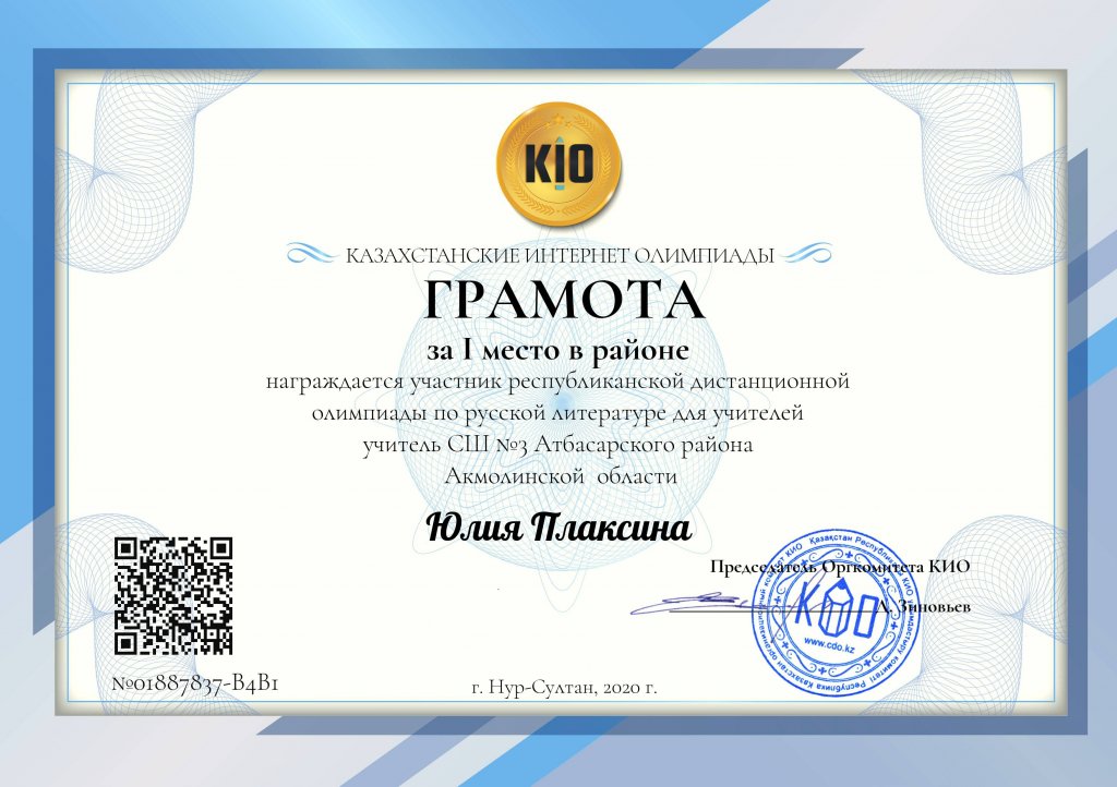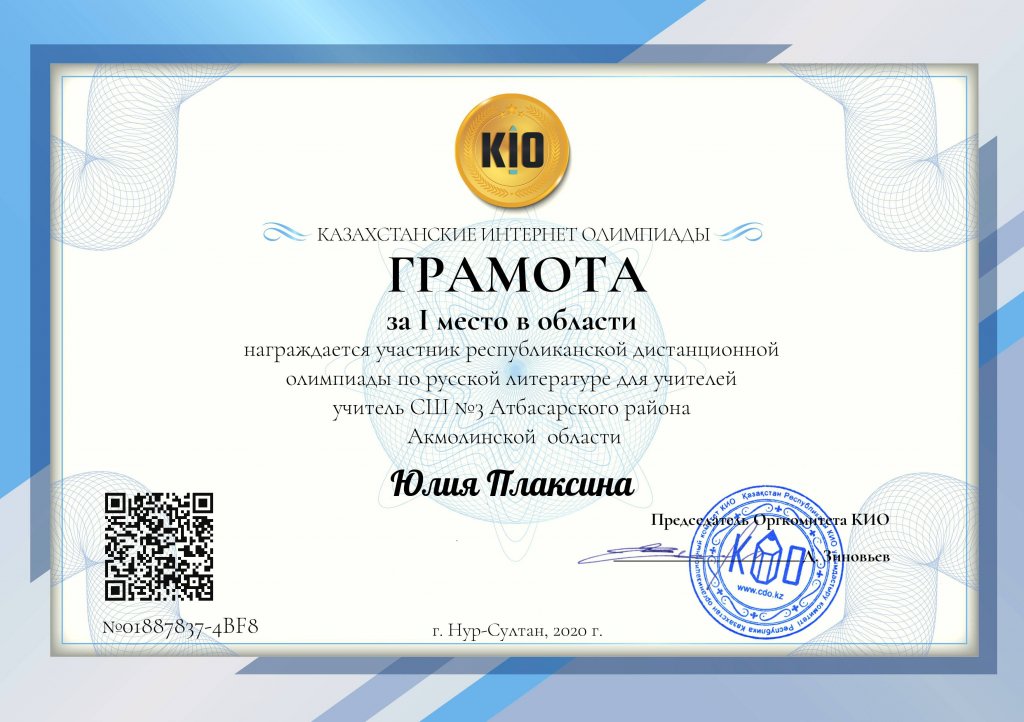 2020 жылдың 17-19 қараша аралығында мұғалімдерге арналған Орыс әдебиеті бойынша олимпиаданың қорытындылары шығарылды. Республикалық олимпиадада бірінші орынды және бірінші дәрежелі дипломға Ю. Н. Плаксина ие болды.