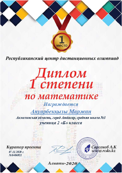 Математика пәні бойынша 1 дәрежелі дипломмен № 3 орта мектептің 2б сынып оқушысы Ануарбекқызы Маржан марапатталады.