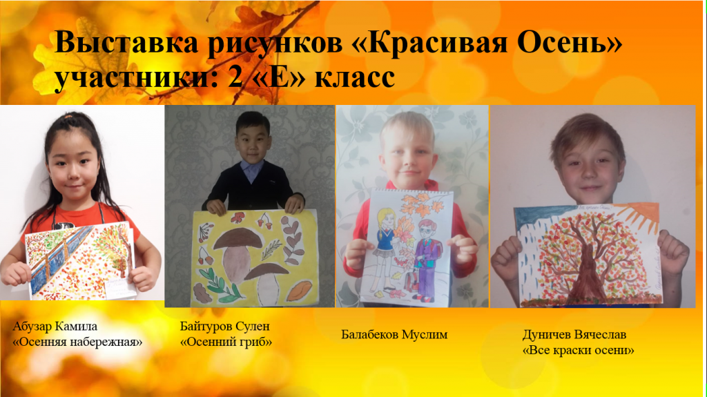 2020 жылдың 11 қарашасында 2 " Е "сыныбында"Әдемі күз" тақырыбына суреттер көрмесі өтті. Мақсаты-балалардың күзгі табиғат құбылыстарына қызығушылығын ояту, күздің сұлулығына эмоционалды түрде жауап беру, оларды "күздің" түсінде жеткізуге үйрету, қиялдау, қиял...