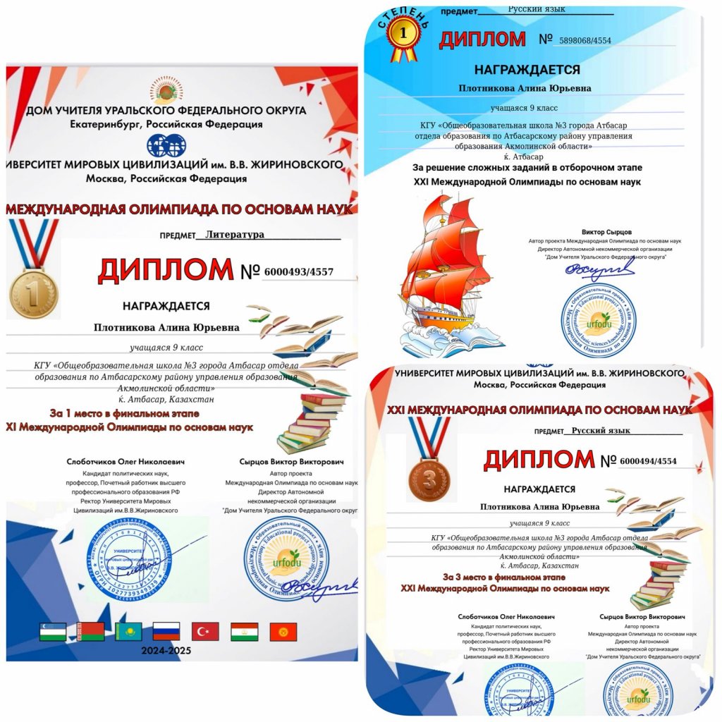 Осымен үшінші жыл қатарынан 10 А сынып оқушысы Алина Плотникова орыс тілі мен орыс әдебиеті бойынша халықаралық олимпиадаға қатысуда. Олимпиада жыл сайын екі кезеңде өтеді: 1 - іріктеу кезеңі және 2 - ақтық кезең. Тапсырмалар стандартты емес, қызықты және көкжиегі кең...