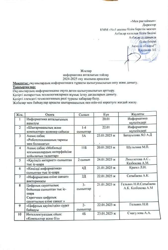 2025 жылғы 20 қаңтарда «Атбасар қаласының No3 ЖОББМ» КММ-де «Информатика» пәні бойынша пәндік аптаның ашылуы өтті. Аталған іс-шараның мақсаты – оқушылардың информатикаға деген тұрақты қызығушылығын ояту және дамыту. Студенттер түрлі сайыстарға белсене қатысты. «Мақал-мәтелді тану» байқауы – оқушыларға белгілі мақал-мәтелдердің бағдарламаланған нұсқаларынан бастапқы мақал-мәтелдерге айналдыруға тура келді. Міндеті: «Ақпараттық шығыс құрылғылары» жұмбағының ашылуы. Компьютер құрылғыларын жазуға арналған жұмыс. Оқушылар информатика пәнін жақсы меңгерді.