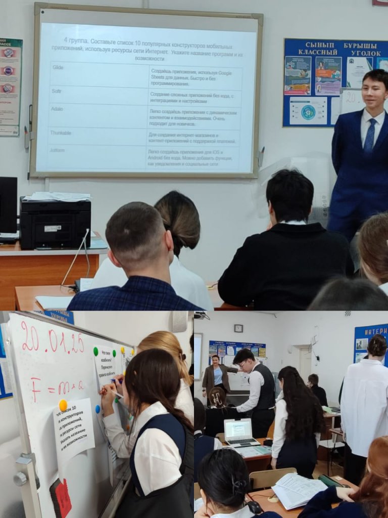 2025 жылдың 20 қаңтарында Информатика апталығының онкүндігінің жоспарына сәйкес 11 сыныпта «Мобильді қосымша жасау» тақырыбында ашық сабақ өткізілді. Сабақтың мақсаты: мобильді қосымшаны жасауға қойылатын талаптарды анықтау; мобильді қосымшаны құрастырушының интерфейсімен танысу; мобильді қосымша интерфейс жасайды. Сабақ барысында оқушылар https://interacty.me/, https://quizizz.com/, Google презентациясы, https://www.educaplay.com/ алаңдарында білім алу, түсіну, талдау, сауаттылықты оқу үшін түрлі тапсырмалар орындады. appinventor.mit.edu алаңында оқушылар практикалық жұмыстарды аяқтап, мобильді қосымшаның дизайнын жасады. Сабақ барысында оқушылар түрлі тапсырмаларды белсенді орындап, алған білімдерін тәжірибе жүзінде қолданды.
