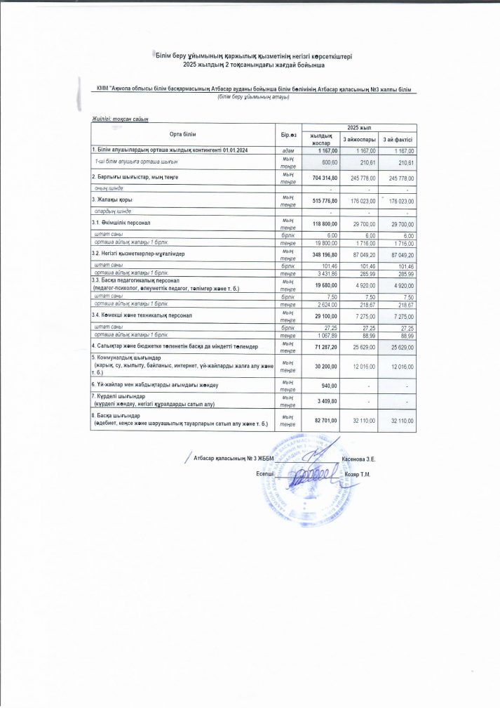 2025 жылғы 2 тоқсандағы жағдай бойынша білім беру ұйымының қаржылық қызметінің негізгі көрсеткіштері
