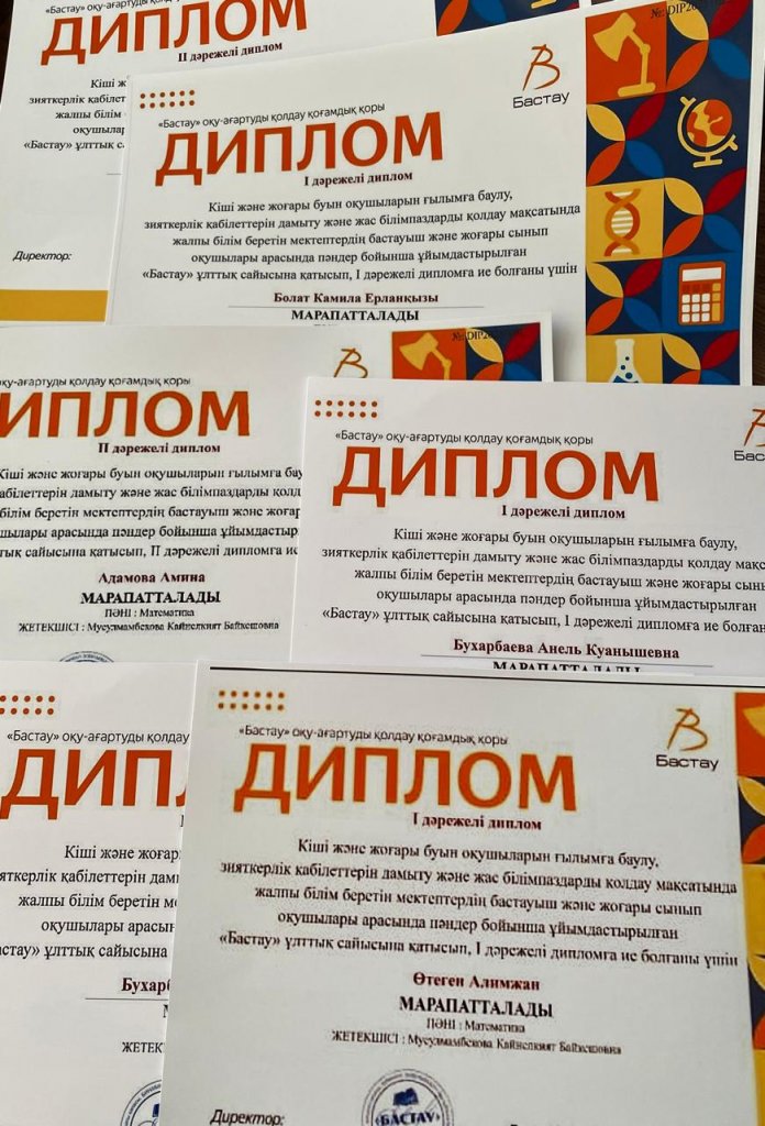 Қашықтықтан олимпиадалар талантты оқушыларды ілгерілетуге ықпал етеді, олар өз күштері мен қабілеттеріне сенімді бола бастайды, құрдастарының арасында үздік болуға ұмтылады. 8 "А" сынып оқушылары "Бастау"қоғамдық білім беруді қолдау қоры өткізген математика пәні бойынша қашықтықтан олимпиадаға қатысты. Тапсырмалар қызықты болды және логикалық ойлауды қажет етті. Олимпиада нәтижелері: Темірбекова Даяна, Өтеген Әлімжан,Шмидт Анжелика, Потапенко Павел. Бұхарбаева Анель-1 дәрежелі диплом иегерлері. Ягудина Элина мен Адамова Амина-2 дәрежелі дипломдар.