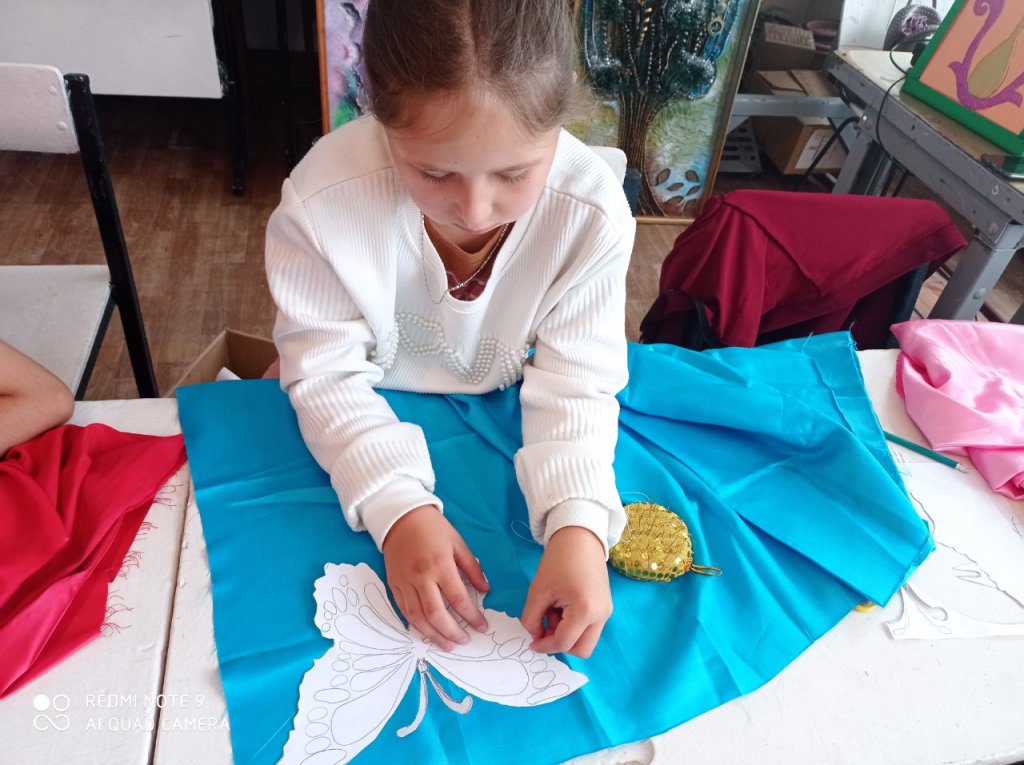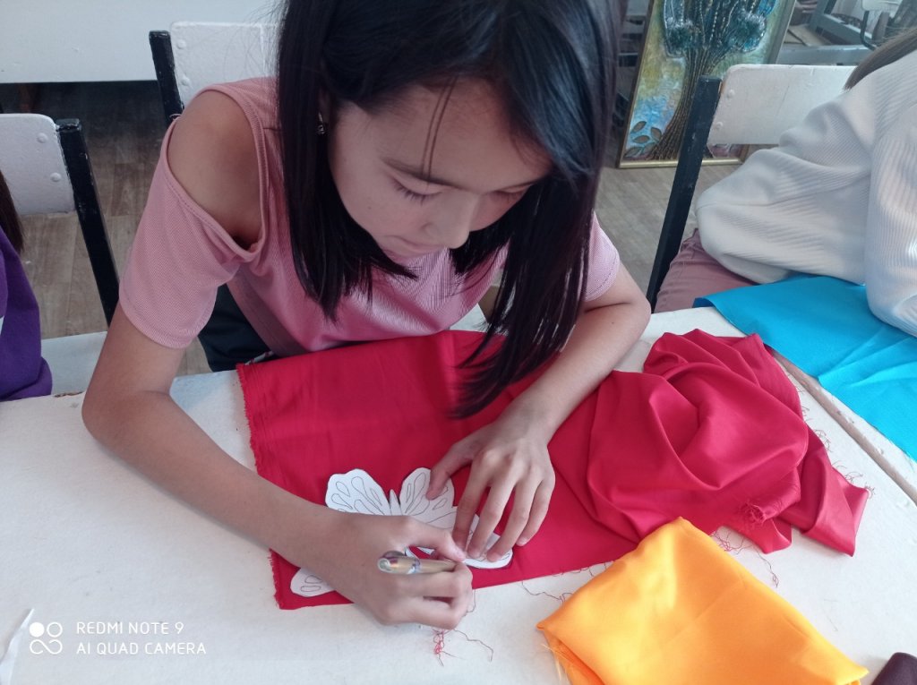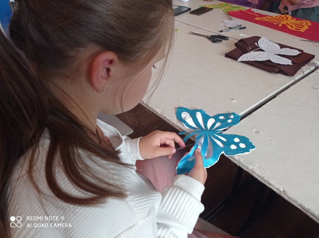 Алдынан, қыздар қағазға көбелектердің эскизін салды. Кейін эскиз бойынша матаның керек түсін таңдап, көбелектердің бөлшектерін кесті. Бұл бөлшектерді өзара байланыстырып, қолмен тікті. Кейін тігін машинасымен тікті. Бұл - өте қиын жұмыс. Ынта мен шыдамдылықты талап етеді.