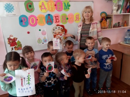 18 қараша күні шағын орталықта "Аяз атаның туған күні"атты кіріктірілген сабақ өтті. Балалар видеоролик көрді, онда көңілдіаққала пен қарға Волгоград облысының солтүстік-шығысында Аяз Атаның Ұлы Устюг қаласында тұратын негізгі орны туралы айтып берді. 18 қарашада Аяз Ата арнайы пошта бөлімшесін ашады, онда жаңа жылдық хаттар мен құттықтаулар қабылдайды, ал әрине, оған балалардан хаттар келіп, онда олар қандай сыйлықтарды алғысы келетінін жазады. Аяз Ата Жаңа жылға сыйлықтар әкеледі, ал оны құттықтауды ұмытады,бірақ біздің балалар Ұмытқан жоқ, олар Аяз Атаға шырша ойыншықтарын салып, оған сыйлады. Аяз ата, әрине, балаларға дәмді тосынсый дайындады.