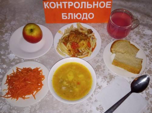 Күнделікті бақылау тағамдары шығарылады: бұршақ сорпасы, макарон, туралған етт, сәбіз салаты, желе, нан.
