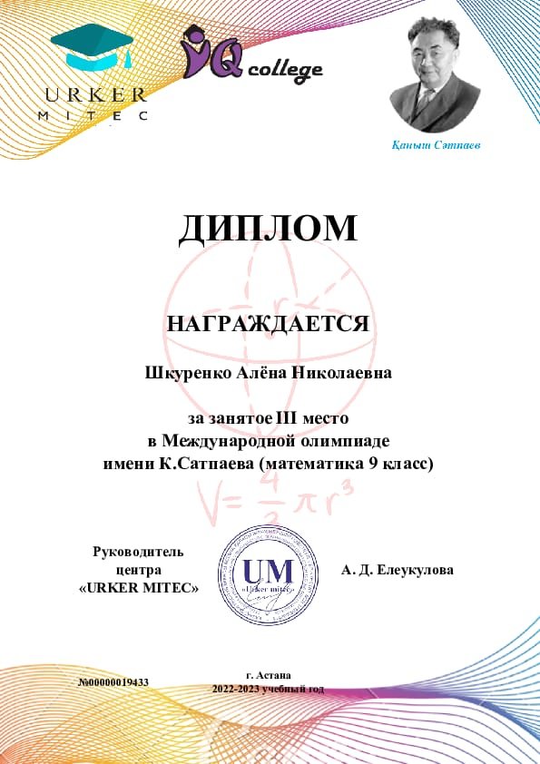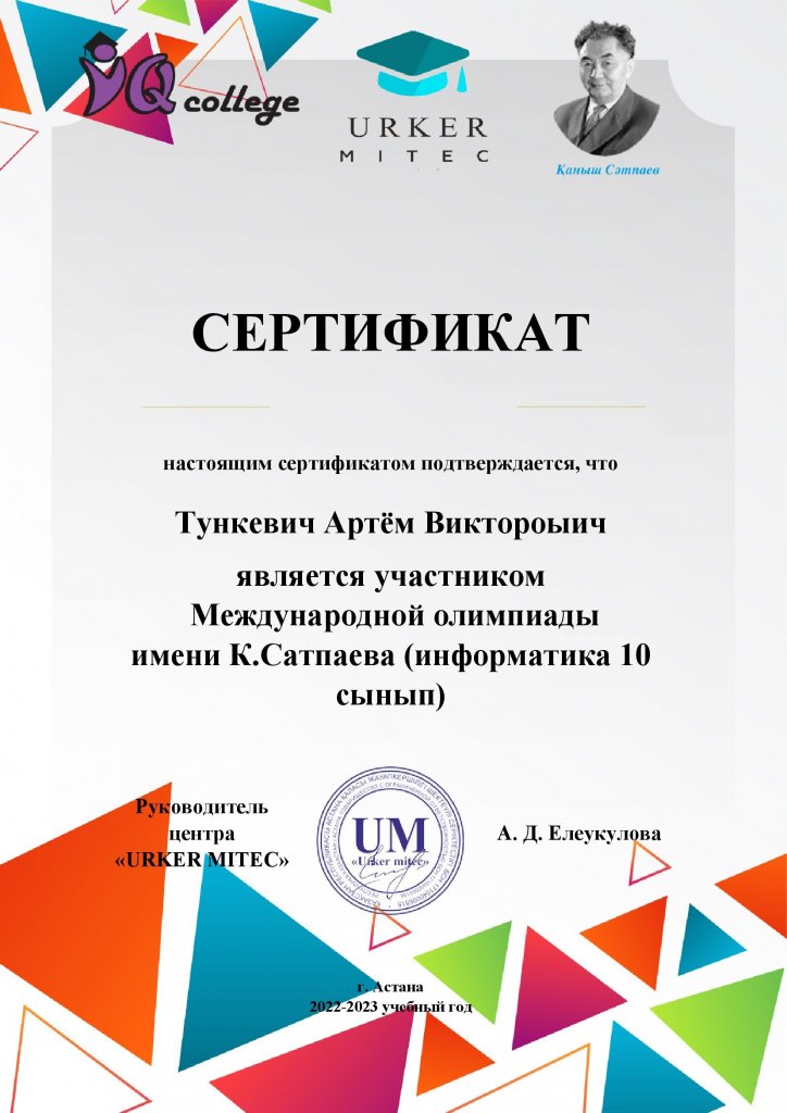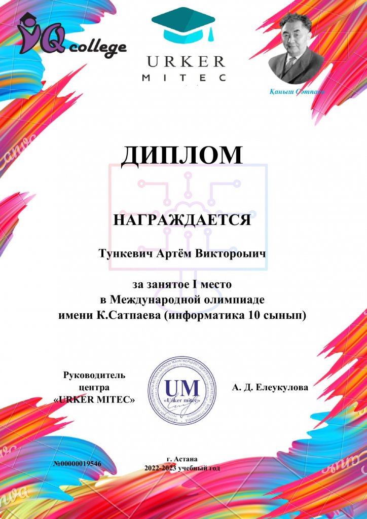 C 2023 жылғы 09 қаңтардан бастап 27 қаңтарға дейін www ресми сайтында жоғары деңгейдегі олимпиадаларға қатысу үшін жоғары мектеп оқушыларының Олимпиадалық резервін қалыптастыру және одан әрі даярлау мақсатында.iqco онлайн форматта жаратылыстану-математикалық бағыт бойынша (математика, физика, химия, биология, информатика) 9-11 сынып оқушылары үшін Қ.Сәтбаев атындағы Халықаралық кешенді Олимпиада өткізілді. Біздің мектептің оқушылары математика және информатика пәндерінен қатысты. Доценко Анель, Шкуренко Алена және Тункевич Артем қатысушылардың сертификатына ие болды. Математикадан 3 орын алғаны үшін Шуренко Алинаны, информатикадан бірінші орын алғаны үшін Тункевич Артемді құттықтаймыз!