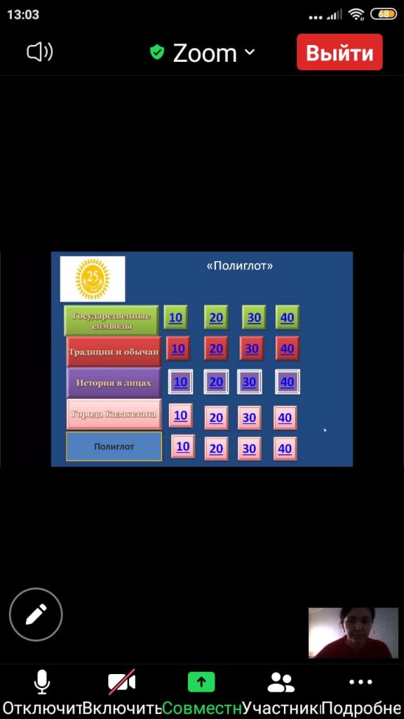 10 қарашада 6" Г "сыныбында «Бәрін білгім келеді!» ZOOM платформасында. Ойынның мақсаты: қазақстандық патриотизмді қалыптастыру; оқушылардың танымдық және шығармашылық белсенділігін дамыту; оқушылардың ой-өрісін кеңейту.