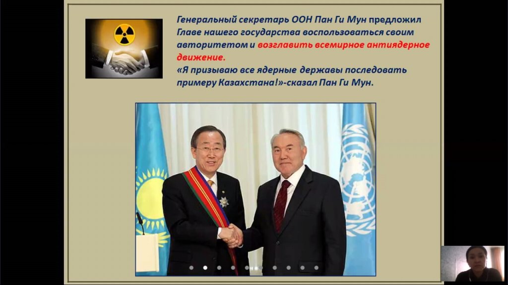 2020 жылдың 27 қарашасында 5-11 сынып оқушылары арасында Қазақстан Республикасының Тұңғыш Президенті Күнін мерекелеу аясында тарих пәнінің мұғалімі Б.Е. Иржанованың "Тұңғыш Президент - Елбасының Қазақстанды ядролық қарусыз мемлекетке айналдырудағы рөлі" атты конференциясы өтті. Конференция барысында оқушылар презентацияны тамашалады. Семей ядролық полигонын жабу және Елбасының халықаралық ядролық қарусыз әлем қозғалысына қосқан тарихи үлесі туралы мәселелер талқыланды.