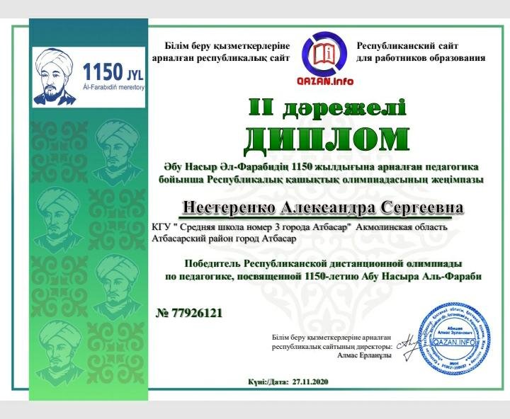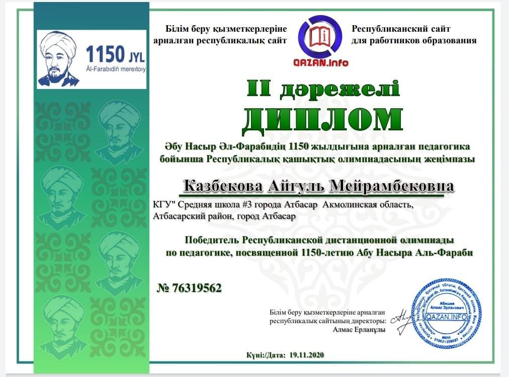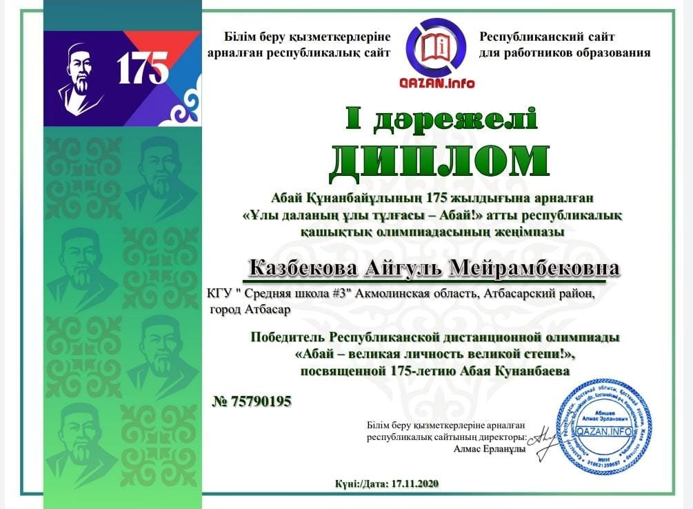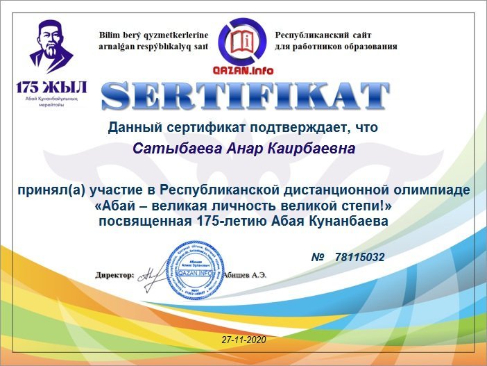 27 қарашада бастауыш сынып мұғалімдері Әбу Насыр Әл-Фарабидің 1150 жылдығына арналған педагогика бойынша Республикалық қашықтық олимпиадаға және Абай Құнанбаевтың 175 жылдығына арналған "Абай ұлы даланың ұлы тұлғасы" қашықтық олмимпиядаға белсене қатысты. Нәтижесінде құрметті орындарға ие болып, дипломдар мен сертификаттармен марапатталды.
