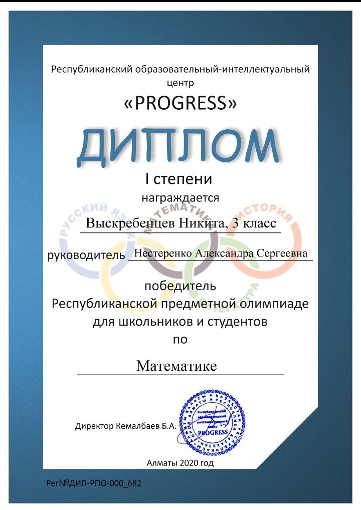 3 «Г» сынып оқушысы Выскребенцев Никита математика пәні бойынша оқушылар мен студенттерге арналған республикалық пәндік олимпиаданың жеңімпазы атанды және қатысқаны үшін сертификатпен және бірінші дәрежелі дипломмен марапатталды, онда математика пәні бойынша жоғары білім сапасын көрсетті.