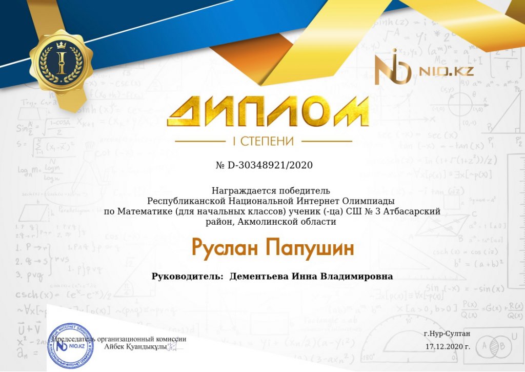 3 "Б" сынып оқушылары Папушин Руслан мен Мажитов Мансур математика пәні бойынша Ұлттық Интернет Олимпиадаға қатысып, 1 орын алды! Руслан мен Мансурды керемет нәтижемен құттықтаймыз! Жарайсыңдар! Сондықтан алдағы табыстар мен жаңа жеңістерді сақтаңыз!