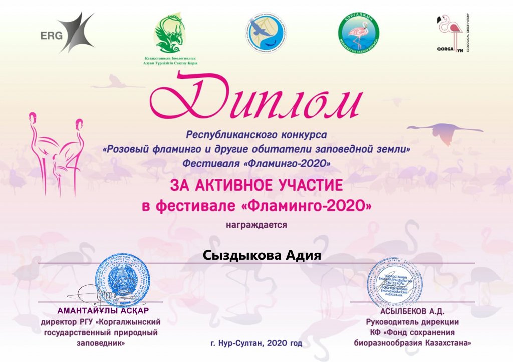 10 сынып оқушысы Сыздыкова Адия «Фламинго -2020» атты фестивальға белсенді қатысқаны үшін дипломмен марапатталады.